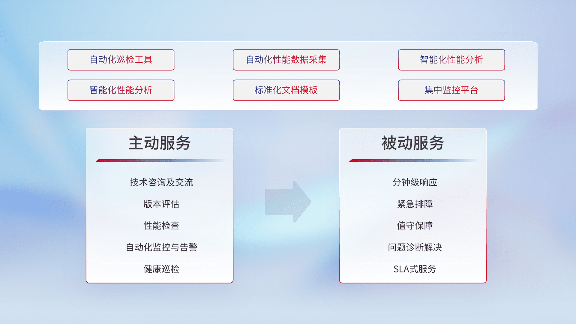 智能化工具和标准化文档,,保障服务质量,,,提供主动服务(包含技术咨询、、、、版本评估、、、性能检查、、、自动化监控与告警、、、、健康巡检)和被动服务包含(分钟级响应、、、紧急排障、、、、值守保障、、、、问题诊断解决、、、SLA服务)。。。